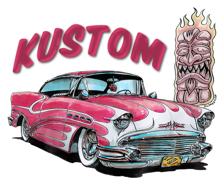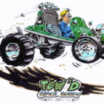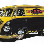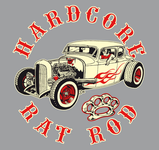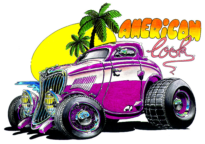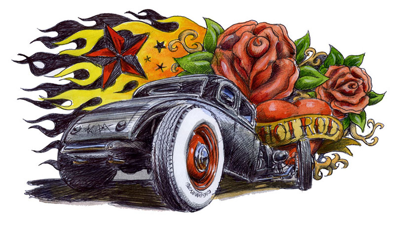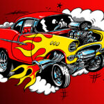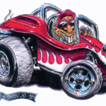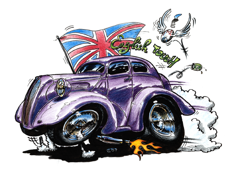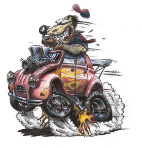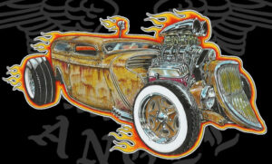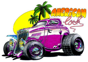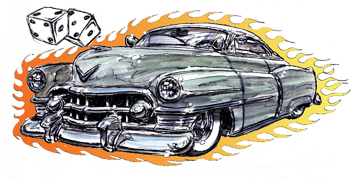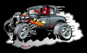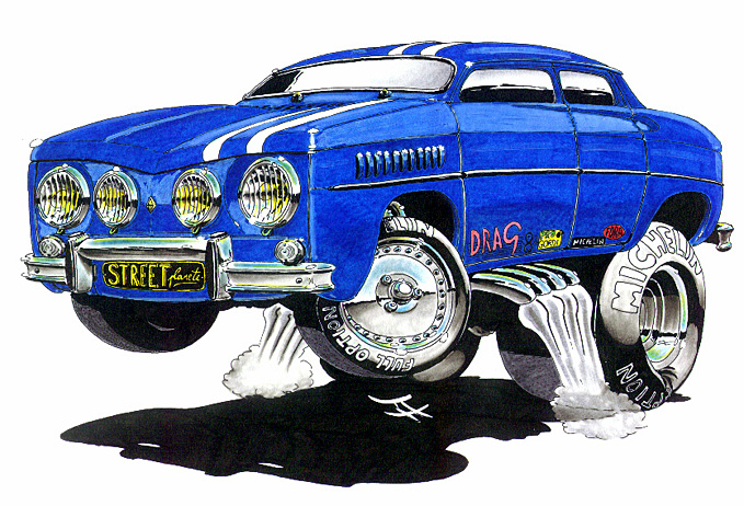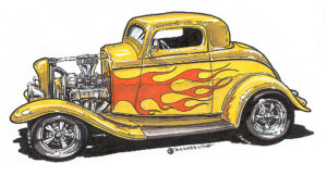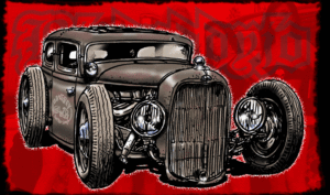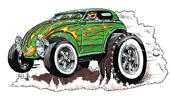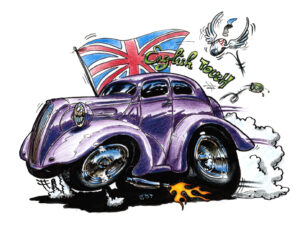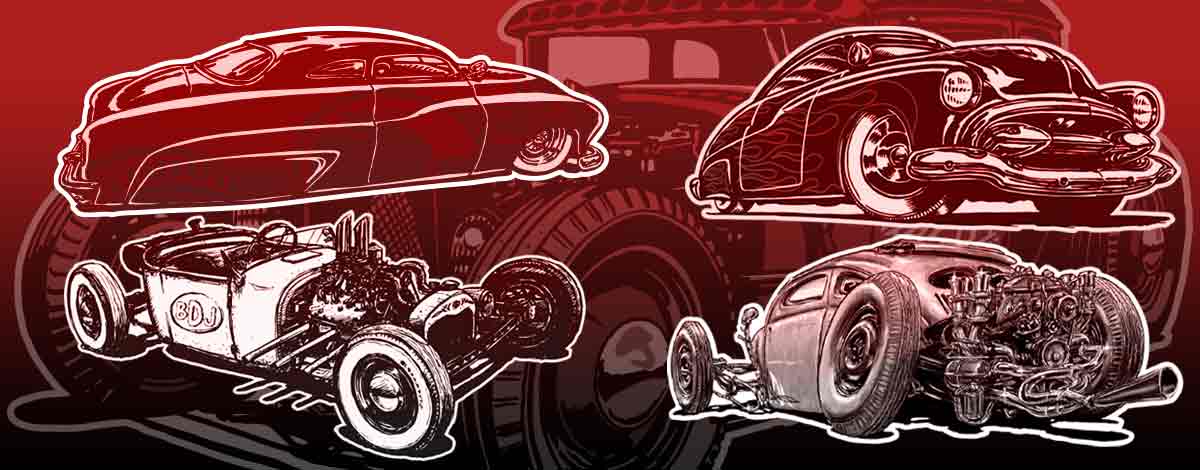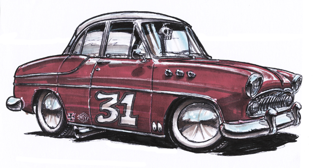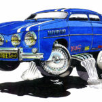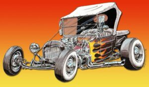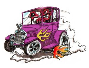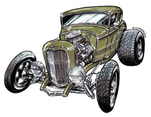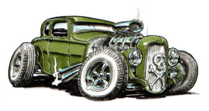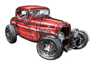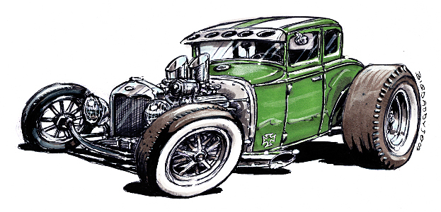 Illustrations inspirĂ©es des vĂ©hicules hors du commun : hot-rods, leadsleds, cox, buggy…